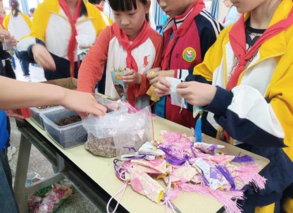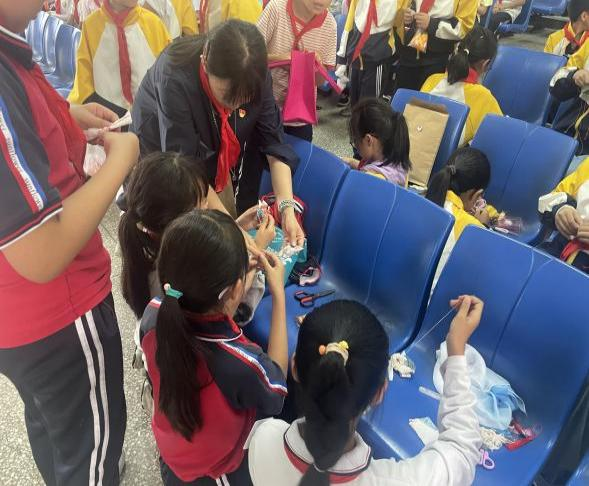 制作香囊是端午民俗之一,活动现场志愿者们还向同学们分发了薄荷、丁香、玫瑰、厚朴等中草药香囊配料,讲解端午节香囊的由来、寓意、制作方法及佩戴技巧。在志愿者和大队辅导员的带领下,同学们有条不紊地按照步骤制作香囊,从穿针引线到填充中草药配料再到缝合收尾,一针一线把最美好的祈愿与祝福缝进香囊里,在沉浸式体验中感受中医药文化的博大精深。