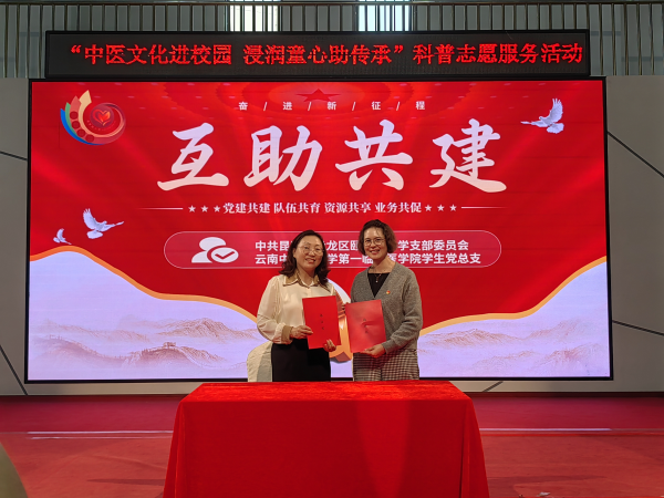 第一临床医学院学生党总支与中共昆明市盘龙区颐惠园小学支部进行了互助共建签约仪式。双方签署了《党组织党建互助共建协议》,以“党建共推、阵地共建、队伍共育、资源共享、业务共促”为主要内容,结对双方优势互补,着力推动“党建+”赋能铸魂,凝聚发展合力,共同传承和弘扬中医文化,为推动中医药事业发展贡献力量。