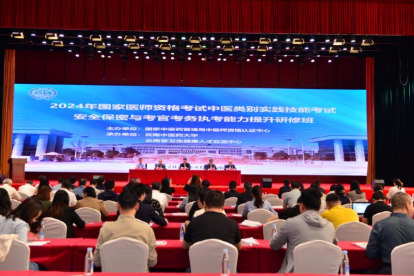 云中讯(教务处)2024年4月24日至26日,由国家中医药管理局中医师资格认证中心主办,云南中医药大学、云南省卫生健康人才交流中心承办的2024年国家医师资格考试中医类别实践技能考试安全保密与考官执考能力提升研修班在昆明开班。国家中医药管理局中医师资格认证中心主任金阿宁、校长丁中涛、云南省卫生健康委二级巡视员黄兴黎、人社部人事考试中心副主任陈方亮、中国中医科学院党委副书记杨会龙出席开班仪式,来自全国31个执业医师资格考试考区的200余名考官、考务代表参加研修培训。