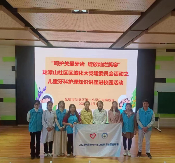 云中讯(通讯员 贾蕊 田桂兰)12月1日,护理学院组织全国大学生口腔健康宣讲团赴呈贡区第一小学广电苑校区开展“呵护关爱牙齿,绽放灿烂笑容”儿童牙科护理知识讲座。龙潭山社区党建工作者、呈贡一小广电苑校区二年级全体学生、老师及家长代表参加本次活动。
