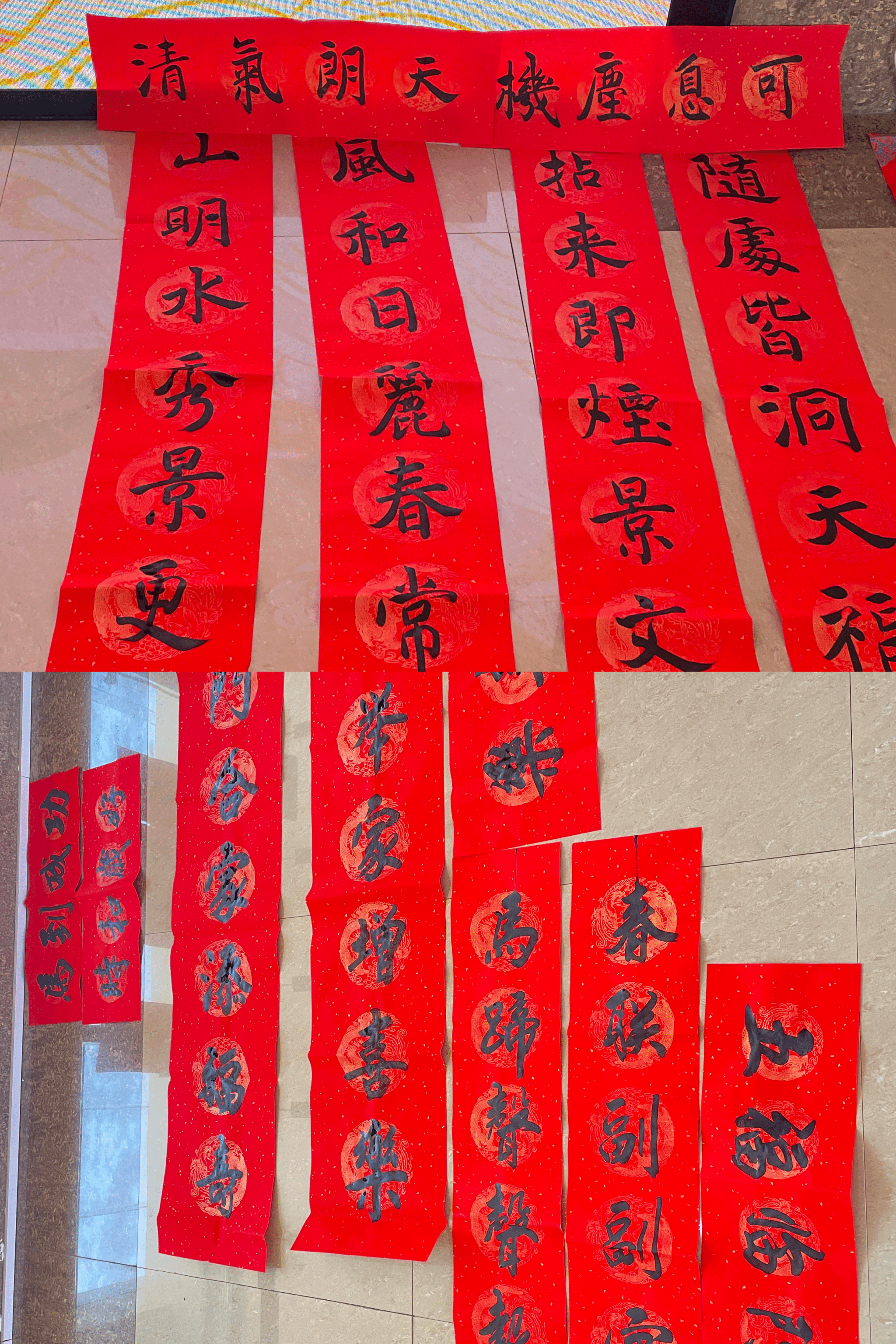 图书馆二楼大厅人头攒动,热闹非凡,求得“墨宝”的师生们将春联齐齐放置,待笔墨晾干。放眼望去,一幅幅寓意吉祥的春联,红纸翻飞、墨香四溢,寄托着师生对新年的美好期盼。