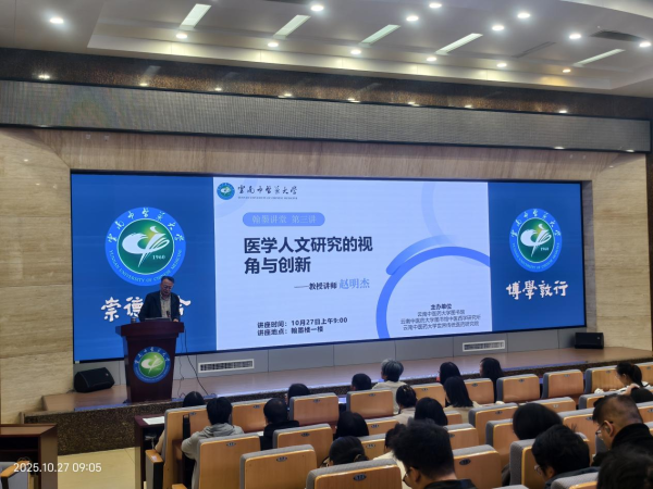 云中讯(通讯员 蒋涛)2025年10月27日上午,云南中医药大学翰墨讲堂第三讲如期举行。本次讲座以“医学人文研究的视角与创新”为主题,由学校图书馆主办,中医西学研究所、世界传统医学研究院承办,特邀教授、主任医师、博士生导师、《医学与哲学》杂志常务主编赵明杰担任主讲嘉宾,160多名师生齐聚翰墨楼一楼报告厅,共同聆听这场兼具理论深度与实践价值的学术分享。