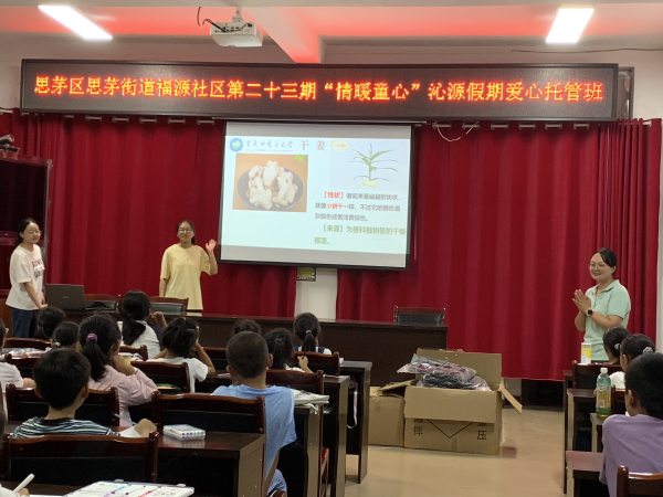 16日下午,一行前往福源社区暑期托管班,与普洱团 市委联合开展“大手牵小手”中医药文化宣传和推普小课堂活动,向托管班捐赠体育活动用品。同学们通过儿歌、绕口令等形式,引导孩子们学说普通话、规范发音,向孩子们介绍了常见的中药材、简单的中医养生知识,并以小游戏的方式带领小朋友们开展互动识药、制作香囊等活动,让孩子们近距离感受中医药文化的独特魅力。