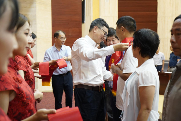 会上举行了退休教师荣休仪式。在观看完退休教师祝福寄语视频后,校领导为退休教师代表佩戴绶带,新进教师代表为退休教师献花,同时退休教师代表为新进教师代表佩戴校徽,将“教育家精神”传承下去。