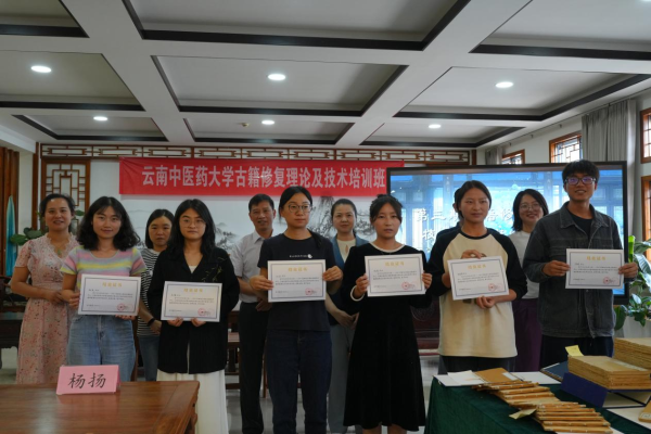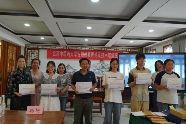 5月17日,云南中医药大学古籍修复理论及技术培训班结业仪式在图书馆滇文轩举行。云南省图书馆历史文献部颜艳萍主任、云南中医药大学图书馆李启勇副馆长、国家级古籍修复技艺传习中心云南传习所导师杨利群等出席本次结班仪式,仪式由图书馆李清林主持。