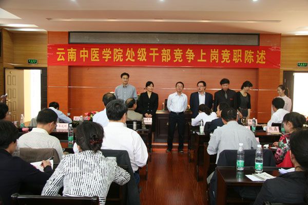 会议第一阶段由学院院长李玛琳同志主持。学院党委书记杨建军同志首先作动员讲话。杨书记指出,学校党委通过这次竞聘,使我校中层干部队伍结构得到优化、充实和加强,真正起到增强团结、树立正气、凝聚力量、加快发展的作用。衷心地希望大家以这次竞聘为契机,更加团结一致,同心同德,扎实工作,为实现学校的新发展做出新的贡献。随后,院长李玛琳教授宣读了《云南中医学院处级干部竞争上岗竞职陈述实施细则》。