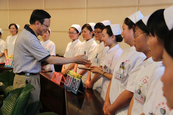 云中讯(附一院宣传科)护士节到来之际,我院第一附属医院的护士们度过了一个“不放假”的护士节。5月11日下午,附一院的护士节庆祝活动——知识竞赛在附一院一号住院楼五楼如期举行,医院所有科室均派出代表,分作五组参与比赛。本次比赛由护理部组织实施,医院党委书记李世辉、副院长包可、叶建州、陈燕溪担任评审团,医院部分职能部分负责人到场观看竞赛。