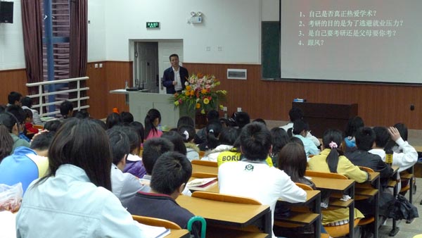 本次讲座的主题为“考研,人上的第二次选择”,主讲嘉宾李海宁老师为150多名面临就业和考研选择的同学讲解了考研过程中大家比较关注的重点、热点问题,与同学们进行了现场互动交流,认真细致回答了广大同学对考研存在的迷惑和考研过程中还需注意的问题。李海宁老师特别针对考研前的自我定位、考研和就业选择,选择考研的同学如何选择学校、如何选择专业、如何选择导师,英语底子相对薄弱的同学应该怎样来突破等方面内容作了重点讲解。