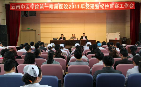 云中讯(附一院党办)2011年4月27日下午,附一院在一号住院楼五楼会议室召开云南中医学院第一附属医院2011年党建暨纪检监察工作会。会议由秦国政院长主持,医院全体党政领导、在职党员、离退休党员代表、学生党员代表、非党员职能部门负责人、护士长以上干部、各民主党派负责人参加了会议。