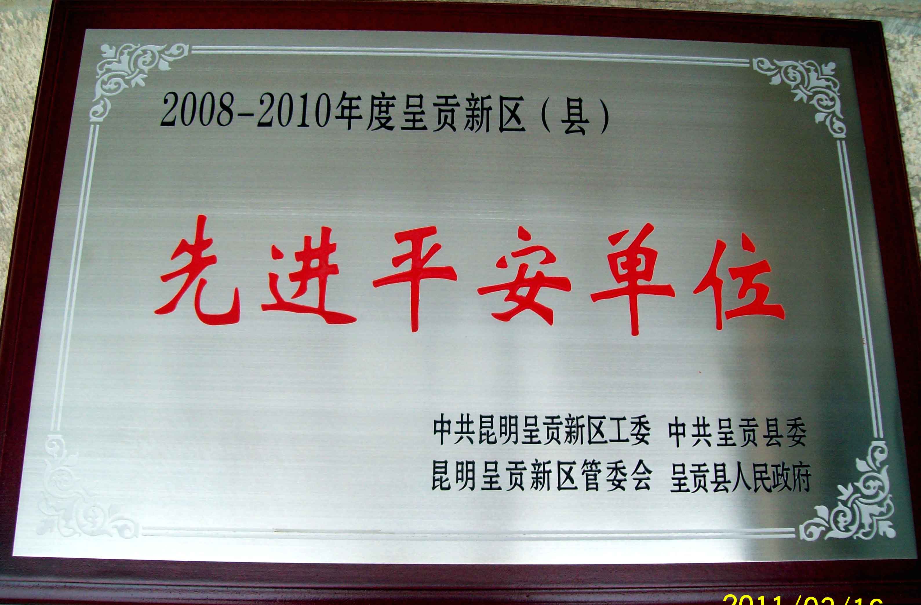 云中讯(保卫处)2011年3月14日下午,在呈贡县政府会议大厅举行中共昆明呈贡新区工委、中共呈贡县委、呈贡新区管委会、呈贡县人民政府关于命名表彰呈贡新区(县)先进平安街道(单位)大会,云南中医学院被授予“2008—2010年度呈贡新区先进平安单位”。