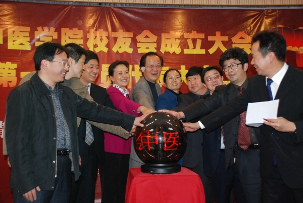李玛琳院长与部分校友代表为校友会揭牌并共同触动彩球启动成立云南中医学院校友会。