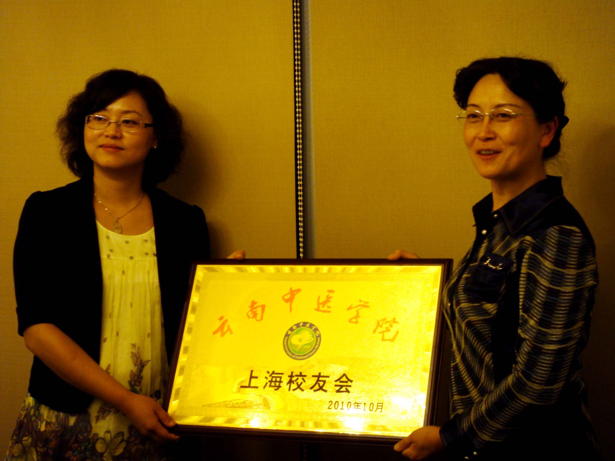 在成立仪式上,大家一致推选我院中药学94级毕业生陈子珺副教授担任上海校友会会长,李玛琳院长向陈子珺会长授云南中医学院上海校友会牌。