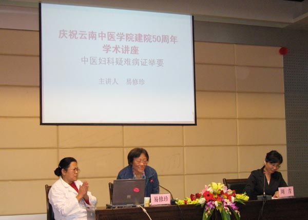 易修珍教授就医者要具备的基本技能素质及妇科疑难病证举要两方面进行了精彩讲解,受到了广大师生好评。易修珍教授为全国第二批名中医专家学术经验继承指导老师、云南省名中医。曾任云南省中医医院妇科主任、云南省中医学会妇科专业委员会主任委员、云南省中西医结合学会妇科专业委员会副主任委员。发表论文《功能失调性子宫出血刍议》、《妇科辨证与辨病初探》、《不孕症的辨证论治》、《子宫内膜异位症的辨证论治》、《中药为主防治妇科开腹术后并发症》、《流产后流血的辨证论治》、《祛瘀固本法治疗子宫内膜异位症并不孕》等30余篇。专著有《中医妇产科急症》。参编《中医乡医必读》及《中医疾病诊疗纂要》。