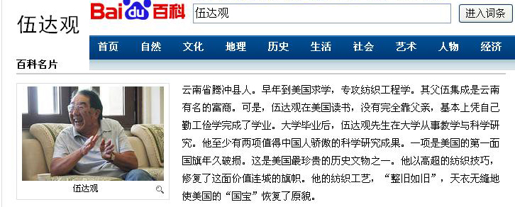 您拥有智慧的头脑及灵巧的双手,以令人惊叹的纺织技巧,巧夺天工地修复了第一面美国国旗——因年久而破损的美国“国宝”,您参与研制发明的人造血管技术,挽救了包括俄罗斯总统叶利在内许多患者,作为作出突出贡献的美国公民,您让世人记住了中国!