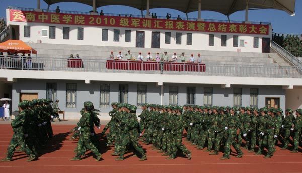 武警昆明指挥学院罗宏副院长代表承训部队作军训总结。他说,这次军训取得了圆满成功,充分展示了2010级全体学生良好的军人素质和崭新的精神风貌,同学们获得了终生受益的精神财富,这些成绩的取得,得益于云南中医学院的高度重视和正确领导,得益于各位老师、军训教官严格管理、科学训练,得益于各位同学刻苦训练、严格要求,他谨代表军训团和各位教官对同学们取得的成绩表示热烈的祝贺。他希望同学们把在军训中学会的尊重、服从、团结、友爱、吃苦、奉献等用于今后的学习和生活中,珍惜大学时光,努力把自己培养成为德智体美全面发展的复合型人才,为祖国的医疗卫生事业做出自己应有的贡献。