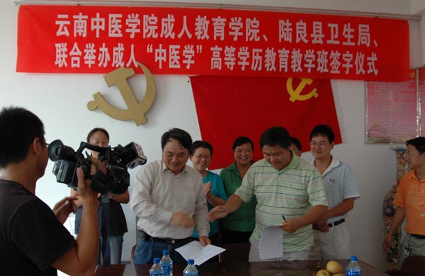 作为“全国农村中医工作先进县”,陆良县不仅有11个病区、450张病床、设备较为齐全的中医院,县人民医院也建有中医门诊,乡、村还有中医诊室,构成县、乡、村三级中医药服务网。为进一步加强陆良县各基层卫生单位的中医药专业人才的培养,我院在陆良县卫生局设立了成人高等学历教育教学点,并签订了合作协议,从今年起开始招收成人高等学历教育学生。
