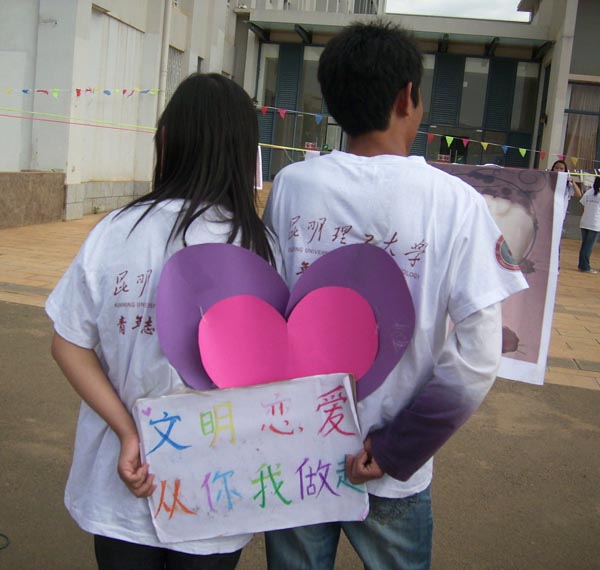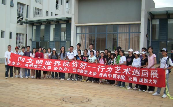 云中讯(院团委) 5月30日下午4点30分,由我院青年志愿者协会与昆明理工大学志愿者协会联合举办的“讲文明,与青年志愿者同行,向文明世界说你好——行为艺术展”在我院学生宿舍门口举行。