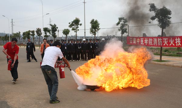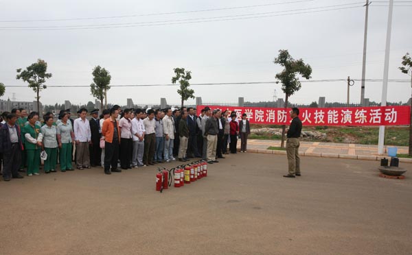 云中讯(宣传部) 针对近期昆明持续干旱,防火形势依然严峻的现状,6月2日下午,学院消防委办公室(保卫处)在呈贡校区再次举行消防灭火技能演练活动。此次活动旨在进一步强化学院师生员工的消防安全意识,掌握实用的消防技能,增强应对火灾和自救的能力,打造平安校园。学生宿舍、食堂餐饮部门、教学楼、图书馆、实验中心、现教中心等消防安全重点场所和部门的工作人员重点参加了培训,各部门安全管理人、安全员、义务消防队员和部分教师、学生也参加了此次消防灭火技能演练活动。