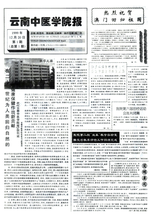 《云南中医学院报》1999年创刊,经过历代校报人的努力,至今已出刊100多期。较省内外其他高校而言,我院校报起步较晚。但在学院党政领导的高度重视和关心支持下,校报一直坚持正确的办报宗旨,始终做到以正确的舆论引导广大师生,以优秀的作品鼓舞广大师生,积极发挥宣传和引导功能,为建设开放文明和谐校园、平安校园,为养成莘莘学子正确的人生观和价值观做出了应有的贡献。