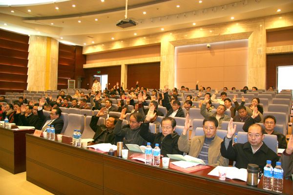 下午2时,大会在雄壮的国歌声中拉开帷幕。大会听取和审议了计财处处长罗文章同志受院长李庆生教授委托所作的《云南中医学院2008年度财务预算执行情况及2009年1-11月财务运行情况报告》;听取了《云南中医学院天润康园职工住宅小区住房认购原则及办法》(草案)以及对该(草案)的说明;审阅了《云南中医学院工会经审委2009年对工会资产审计情况的书面报告》。大会经过表决,审议通过了《云南中医学院“天润康园”职工住宅小区住房认购原则及办法》(草案)和《云南中医学院第二届八次教代会暨第十次工会会员代表大会决议》。