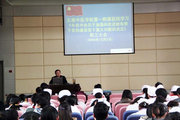 云中讯(附一院党办) 为进一步深入学习贯彻党的十七届四中全会精神,以科学发展观指导医院医疗、教学、科研的各项目标任务,按照第一附属医院党委的统一部署,于2009年12月3日下午在1号住院大楼5楼会议室组织全院职工、党员干部专题学习贯彻党的十七届四中全会精神。会议由医院秦国政院长主持,李琦副书记、彭江云、包可、叶建州副院长以及全体在职党员、护士长以上干部、门诊点负责人、除值班人员外的非党职工参加了会议。第一附属医院党委书记李世辉同志在会上传达中国共产党第十七届中央委员会第四次全体会议精神,并理论联系实际,结合医院的实际情况,对全会精神进行了解读。