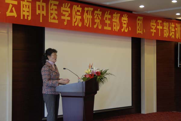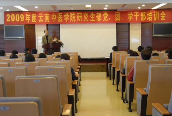 云中讯(研究生部) 2009年11月26日,以“增强服务意识,提高管理能力,努力向研究生自我管理模式转变”为主题的云南中医学院2009年度研究生党、团、学学生干部培训会,在呈贡校区科技信息大楼二楼报告厅顺利举行 。学院副院长郑进教授,组织部卞瑶部长,研究生部淤泽溥主任,研究生部党总支杨鹤清副书记,基础医学院分管研究生工作的陈文慧副院长,中药学院分管研究生工作的张庆芝副院长等领导出席本次培训会。来自研究生部党总支下属各党支部、研究生团委、研究生会和研究生各教学班的学生干部共73人参加了本次培训。
