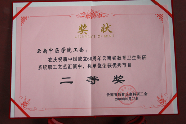 云中讯(工会)今年是新中国成立60周年。为迎接国庆节这一全体人民同庆共和国生日、共享中华民族荣光的欢乐时刻的到来,根据云教工(2009)37号文《关于举办庆祝新中国成立60周年云南省教卫科系统职工文艺汇演的通知》要求,工会在学院党委、行政的高度重视下,在公共课程部的大力支持下,选送了舞蹈《心驰神往》参加了汇演。这次文艺汇演既是一场隆重的纪念活动,也是一次职工整体素质和精神风貌的全新展示,参加本次教卫科系统职工文艺汇演的共有41家单位,经过激烈的比赛,我院选送的节目《心驰神往》获得了二等奖。