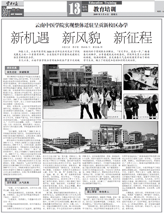 (本报记者 李沙青 李启昌) 阳春三月,云南中医学院7000余名师生共同见证了学院发展史上的一个重要里程碑:全省高校中首家整体成建制迁驻呈贡新校区办学。