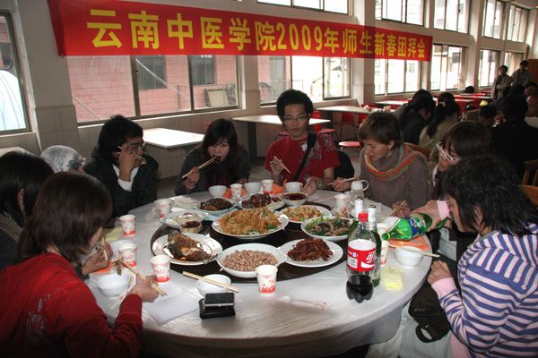 云中讯(宣传部) “银鼠辞旧岁,金牛迎新春”,在中华民族传统佳节牛年春节到来之际,1月25日农历除夕中午,我院白塔校区食堂二楼喜气洋洋,春意融融,欢声笑语不绝于耳,学院2009年师生新春团拜会在此举行。学院党委委员、副院长郑进教授率学工部(学生处)、基础医学院、中药学院、临床医学院、研究生部、对外合作交流中心、后勤服务中心等有关部门负责人出席了团拜会。包括12名留学生在内的130余名师生员工齐聚一堂,同贺新春佳节,共进团圆年饭。团拜会现场洋溢着喜庆祥和欢乐的气氛。