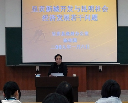 下午,由社科部主办的“呈贡新区开发与昆明社会经济发展若干问题讲座”在呈贡校区1101教室举行。讲座邀请到呈贡县人民政府办公室主任杨相国前来讲授,社科部张丽主任主持。杨相国主任从新昆明建设战略提出、呈贡新区建设概况、大学城建设进展、呈贡县社会经济发展情况等四个方面,对呈贡新区开发与昆明社会经济发展情况进行了详细介绍,特别针对同学们所关注的新区失地农民生存问题做了细致解答,重点突出介绍了县委县政府针对被征地农民实施的“四大保障”、“五大转变”等政策。讲座提问时间,同学们就“新区农民住房保障以一换二具体实施办法”、“新区农民再次创业问题”、“大学城社区建设问题”、“新区医疗卫生系统规划问题”、“大学生呈贡就业创业信息问题”等与专业学习相关问题提问,杨相国主任一一给予解答。他精辟的总结、深刻的分析、广阔的视野受到同学们的热烈欢迎,赢得了阵阵掌声。最后,张丽主任作总结发言,同时希望杨相国主任以后能够为我院广大学生开展类似讲座。