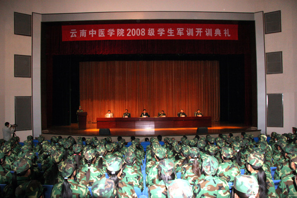 云中讯(宣传部)  2009年1月1日下午3点,我院2008级学生军训开训典礼在昆明陆军学院礼堂隆重举行。学院党委副书记、国防教育工作领导小组组长王翠岗,昆明陆军学院训练部军训办公室主任朱平上校,一大队政委晏吉虎上校出席开训典礼。院党办、学工部(处)、武装部、教务处和基础医学院、中药学院、社科部有关负责同志,带训教师、全体教官及1045名2008级参训学生参加了开训典礼。开训典礼由昆明陆军学院田景大校主持。