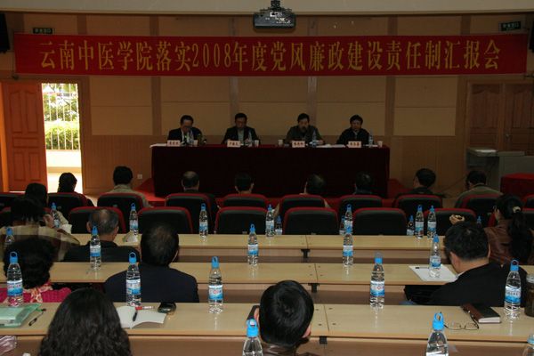 上午8点30分,学院在关上校区教学南楼报告厅举行云南中医学院落实党风廉政建设责任制汇报会。汇报会由学院党委副书记、院长李庆生同志主持,学院党委书记郭玉鉴同志代表学院党委、行政汇报了我院2008年党风廉政建设责任制工作情况。省委高校纪工委书记、省教育厅纪检组组长杨共和同志代表检查考核组作了责任制考核动员讲话。杨书记从责任制考核工作的重大意义、程序标准、组织实施等三个方面作了动员讲话,并结合全省教育系统实际,对明年进一步抓好责任制工作落实提出了具体要求。李庆生院长代表学院表态,他指出杨书记的讲话,对我院明年进一步抓好责任制落实工作有很强的针对性和指导作用,我们一定要认真落实好杨书记的讲话精神,进一步统一思想,提高认识,增强抓好党风廉政建设责任制工作的使命感和自觉性,进一步推动我院党风廉政建设责任制贯彻落实。