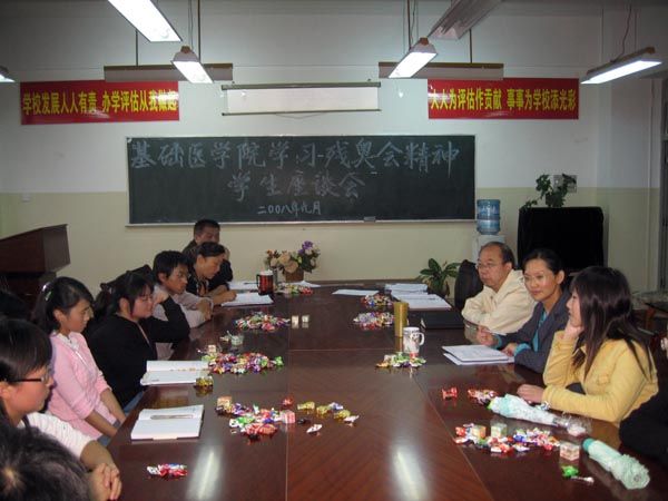 云中讯(基础医学院)  2008年9月18日, 北京残奥会圆满落幕。中国代表团332名残疾运动员发扬了自强不息、奋勇争先的精神,赛出了水平和风格,蝉联金牌榜和奖牌榜第一,实现了历史性的新跨越。为鼓励基础医学院残疾学生以自强不息、奋勇拼搏的精神,努力克服困难,圆满完成学业,2008年9月27日下午5点,基础医学院党总支组织关上校区残疾学生举行学习残奥会精神座谈会。
