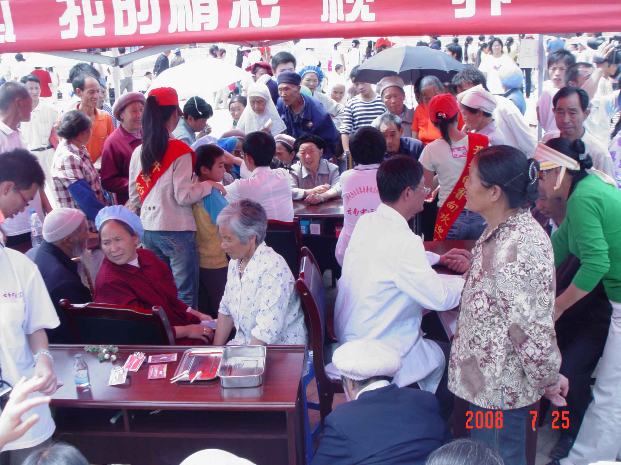 2008年7月25日,我院师生在鲁甸县城“三下乡”活动现场送医送药的场景。