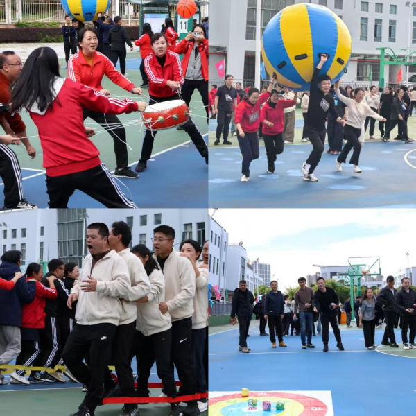 教职工集体项目设有“同心击鼓”“沙包投掷”“巨人的脚步”和“鸿运当头”四个集体趣味项目,集趣味性、协作性和竞技性于一体,考验各代表队的团队协作能力。运动会现场气氛热烈,充满了欢声笑语与加油呐喊声,平日忙于工作的教职工们,此刻都化身为活力四射的运动健将,大家在轻松愉快的氛围中挥洒汗水,享受着运动带来的乐趣,整个运动场都沉浸在团结、奋进、和谐的氛围中。