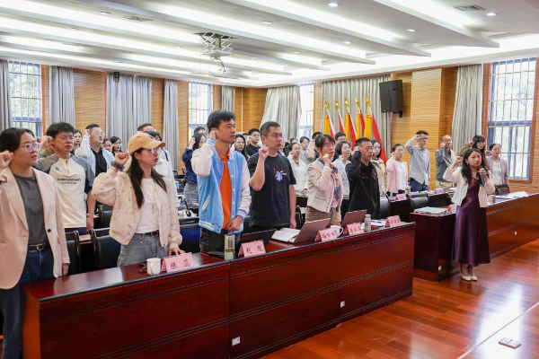 校党委书记邱勇、副校长俞捷与新入职教师合影。开班仪式上,俞捷代表学校党委、行政对新入职教师表示欢迎和祝贺,带领全体新入职教师宣誓教师誓词,作培训动员讲话,并以“广阔天地,大有可为”为主题开展专题授课。