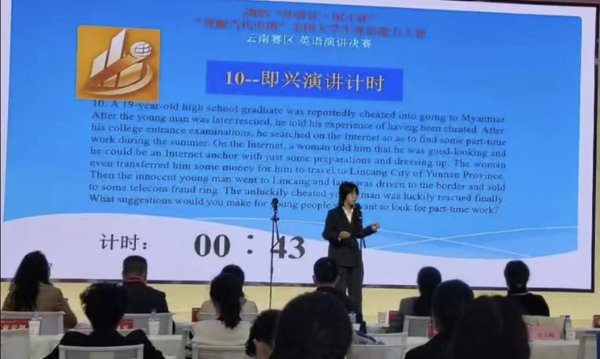 云南省赛区决赛分两轮进行,首轮为定题演讲和即兴问答,第二轮为即兴演讲。全省81名选手围绕“Strike the Waves”主题进行角逐,我校基础医学院陈宥丞、第一临床医学院周许琳和彭婧仪3名同学,凭借扎实的语言功底、流畅的表达能力、深厚的思辨水平及沉着冷静的台风,在第一轮激烈的竞争中脱颖而出,顺利晋级第二轮。第二轮共有36名晋级选手参与角逐,主要考察选手即时反应、语言组织及逻辑构建能力。