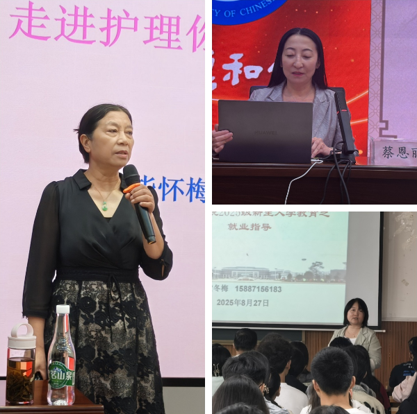 毕怀梅教授以“如何树立职业自信和信念——走进护理你准备好了吗”为题,分享个人职业成长故事,以亲身经历传递护理职业的温度与价值,点燃新生职业热情。蔡恩丽教授通过“考研启蒙教育”,为有深造意向的新生铺就早期规划路径。学院党委副书记黄冬梅结合“护理毕业生就业形势”为学生分析了行业就业趋势,解读就业政策与求职技巧,为新生树立“早规划、早准备”的就业意识,让他们在入学之初就锚定职业发展的长远目标。