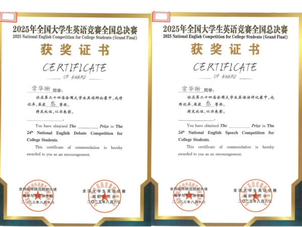 全国大学生英语竞赛是我国规模最大、影响力最广的大学生英语综合能力竞赛之一。本次总决赛由全国高等师范院校外语教学与研究协作组和全国大学生英语竞赛组委会主办,汇聚了来自各省(自治区、直辖市)竞赛组委会和参赛院校推荐的300余名优秀选手,赛事涵盖英语演讲、辩论、风采大赛等多个项目,竞争激烈。常华晰同学在比赛中沉着冷静、思维敏捷、表达流畅,充分体现了我校外语教学的扎实基础和育人成果。