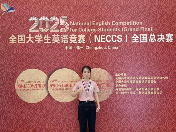 云中讯(外语部)8月2日至7日,2025年全国大学生英语竞赛(NECCS)全国总决赛在河南郑州举行。第一临床医学院2022级中医8班学生常华晰代表学校参赛,她凭借扎实的语言功底、出色的综合素养和稳定的现场发挥,荣获“全国英语演讲比赛三等奖”和“全国英语辩论赛三等奖”,展现了我校学子的卓越风采。