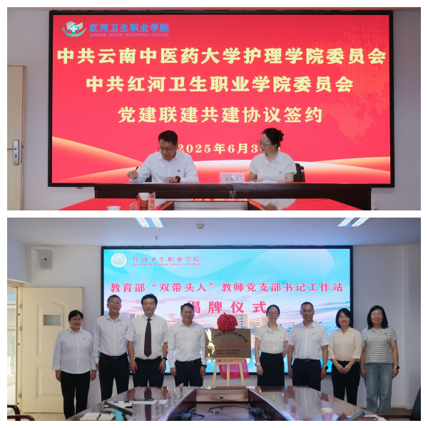 活动中,双方签署《党建联建共建协议》,并举行教育部“双带头人”教师党支部书记工作站揭牌仪式。随后,两校护理学院围绕“党建引领专业建设”“课程思政育人实践”“学生社区党建模式”等主题展开经验交流。