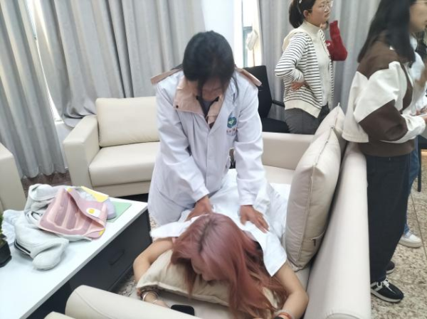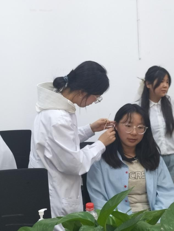在经验分享环节,张兴瑞同学系统演示推拿滚法操作,现场解析手法要领及临床适应症;乔正珍同学以“银发关怀”为主题,结合社区服务案例阐释医患沟通艺术;沈玲宇同学则针对春季多发病症,详解耳穴埋籽等中医特色疗法的辨证施治要点。活动中,志愿者们还开展了推拿、耳穴埋籽、脉诊等活动,让前来参加活动的同学感受到了中医传统疗法的独特魅力。