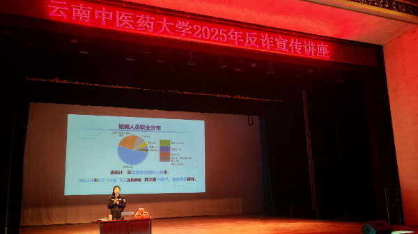 昆明市反电信网络诈骗中心林钰潇警官作反诈宣传讲座。根据当前高校师生被骗典型、高发案例进行剖析讲解,进一步提高师生反诈防诈意识。