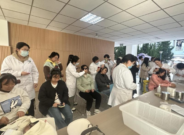 随后,校医院的医护人员和基础医学院“智慧中医”大学生实践团的志愿者同学一起为现场师生进行铜砭刮痧、穴位敷贴、头部经络梳、耳穴压豆、头耳灸、悬灸等特色诊疗服务。这些传统中医疗法以其独特的疗效和舒适的治疗体验,受到了师生们的一致好评,现场人头攒动,气氛热烈。