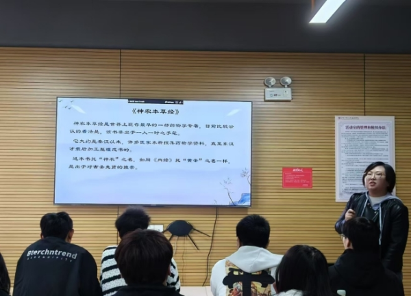 随后,江舟老师为同学们范读了《神农本草经》经典语句,深入讲解文本背景与历史沿革,以及其中的文化意涵。她通过自己的亲身经历详细阐述了《神农本草经》在现代临床治疗中的应用与创新,让同学们深切感受到中医经典的魅力。
