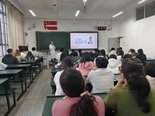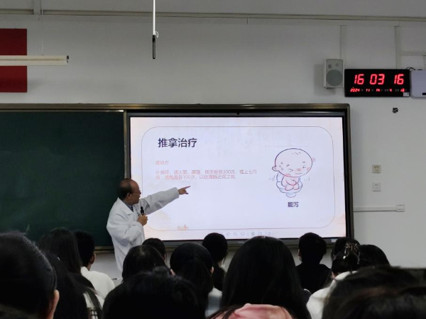 熊光轶讲授了小儿推拿的作用、常用穴位、常见手法和注意事项,实操示范了小儿推拿常用的推、揉、按、摩等基本手法,在同学身上演练了开璇玑、打马过天河、水底捞明月、运土入水等小儿推拿复式操作手法。