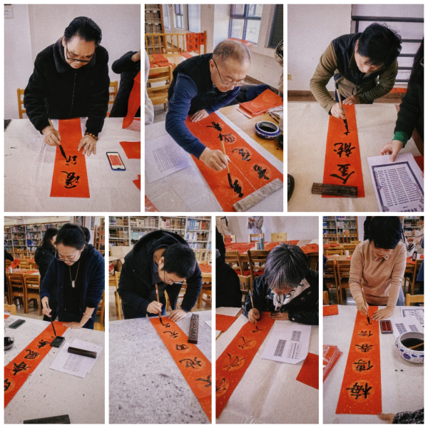 学校第二附属医院莫德敏、徐万所、蔡定格、李应志、黄万琳及图书馆肖丽萍老师,旅法华裔画家马群先生等现场泼墨挥毫,为学校教职工献上了上百幅新春对联。现场师生书法爱好者也加入书写,交流书法技艺。