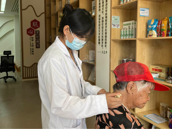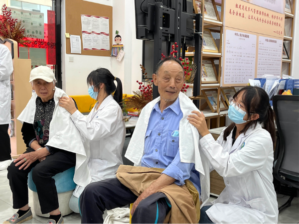 活动中,志愿者们为天润康园和翔盛园的中老年群体提供了免费的艾灸、推拿、测血压等服务,帮助社区居民缓解关节疼痛等症状,让他们亲身体验到中医药的疗效和优势,并通过科普中医药文化,帮他们树立养生新理念。