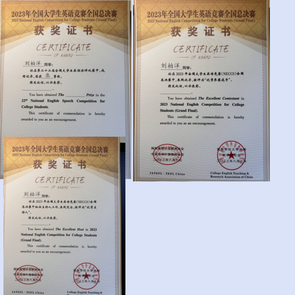 云中讯(通讯员 张金涛)8月2日至7日,2023年全国大学生英语竞赛(NECCS)全国总决赛在宁夏回族自治区银川市举行,第一临床医学院2022级中医9班学生刘柏洋荣获三等奖,并获评“优秀参赛选手”。此外刘柏洋经选拔作为本届大学生英语风采大赛主持人,并获得“优秀主持人”荣誉称号。
