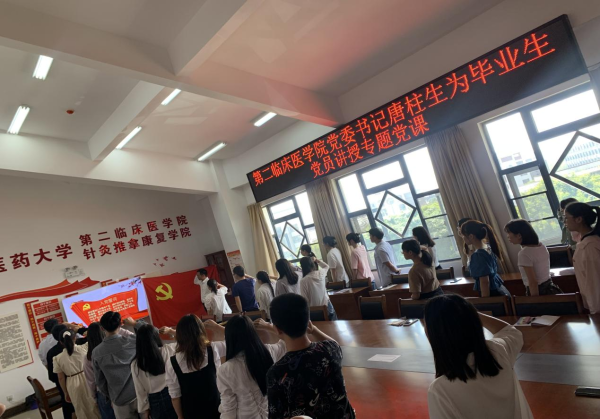 唐柱生带领毕业生党员重温入党誓词,希望毕业生党员们时刻以一名共产党员的标准严格要求自己,在“望、闻、问、切”中,植根基层、救死扶伤,争做一名勇于担当的好党员。